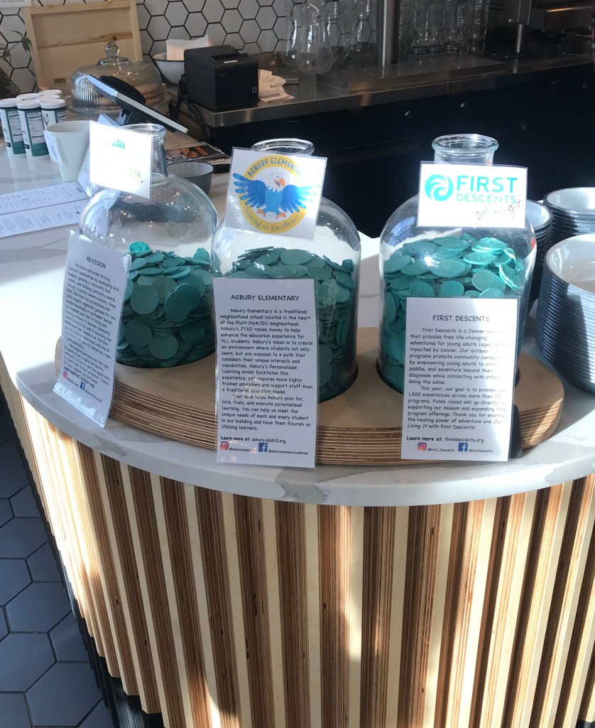 One thing I thought that set Chook apart from other restaurants in Denver, besides their commitment to sustainability and being a Denver Certified Green Restaurant, is their passion to give back to the community. Every month, they pick 3 organizations to give to – usually an organization that is tied to the environment, children, or social matters. When you place your order you are given a token to pick one of the 3 charities. At the end of the month 1% of sales is split between the months 3 charities.